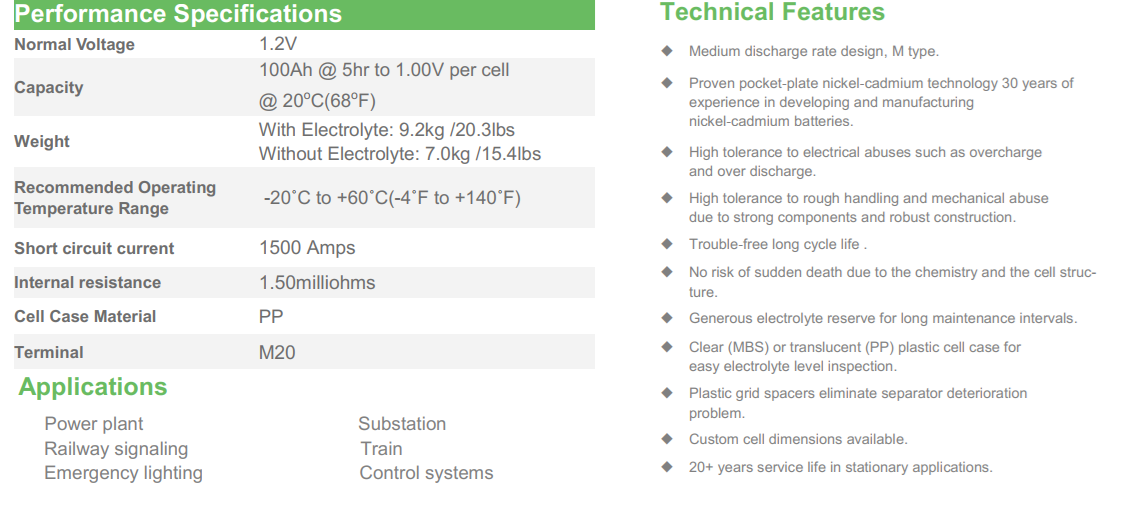 Ắc quy niken cadmium Ni-Cd 100Ah cung cấp giải pháp ổn định và đáng tin cậy cho nhiều ứng dụng điện công nghiệp .Ắc quy Ni-Cd 100Ah hoạt động trong một phạm vi nhiệt độ rộng , chống lạm dụng điện , sốc và rung và chỉ cần bảo dưỡng cơ bản . điều này đảm bảo tổng chi phí sở hữu (TCO) thấp trong vòng đời có thể kéo dài 20 năm trở lên.